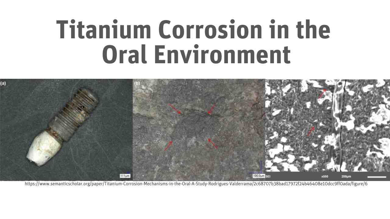 Corrosion of titanium dental implants has been associated with implant failure and is considered one of the triggering factors for peri-implantitis. Corrosion of dental implants is concerning, because a large amount of metal ions and debris are generated in this process, of which accumulation may lead to adverse tissue reactions in the oral environment.