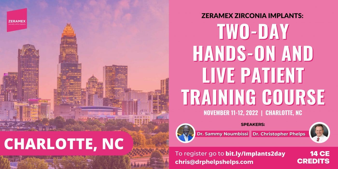 Join Dr. Chris Phelps and Dr. Sammy Noumbissi for this two-day hands-on training course in Charlotte. Zeramex is the leading provider of BioCeramic Zirconia Implants. ZERAMEX will be hosting live demonstrations of the 2 piece ceramic Implants along with tremendous show specials for doctors interested in providing metal-free implants for their patients health.